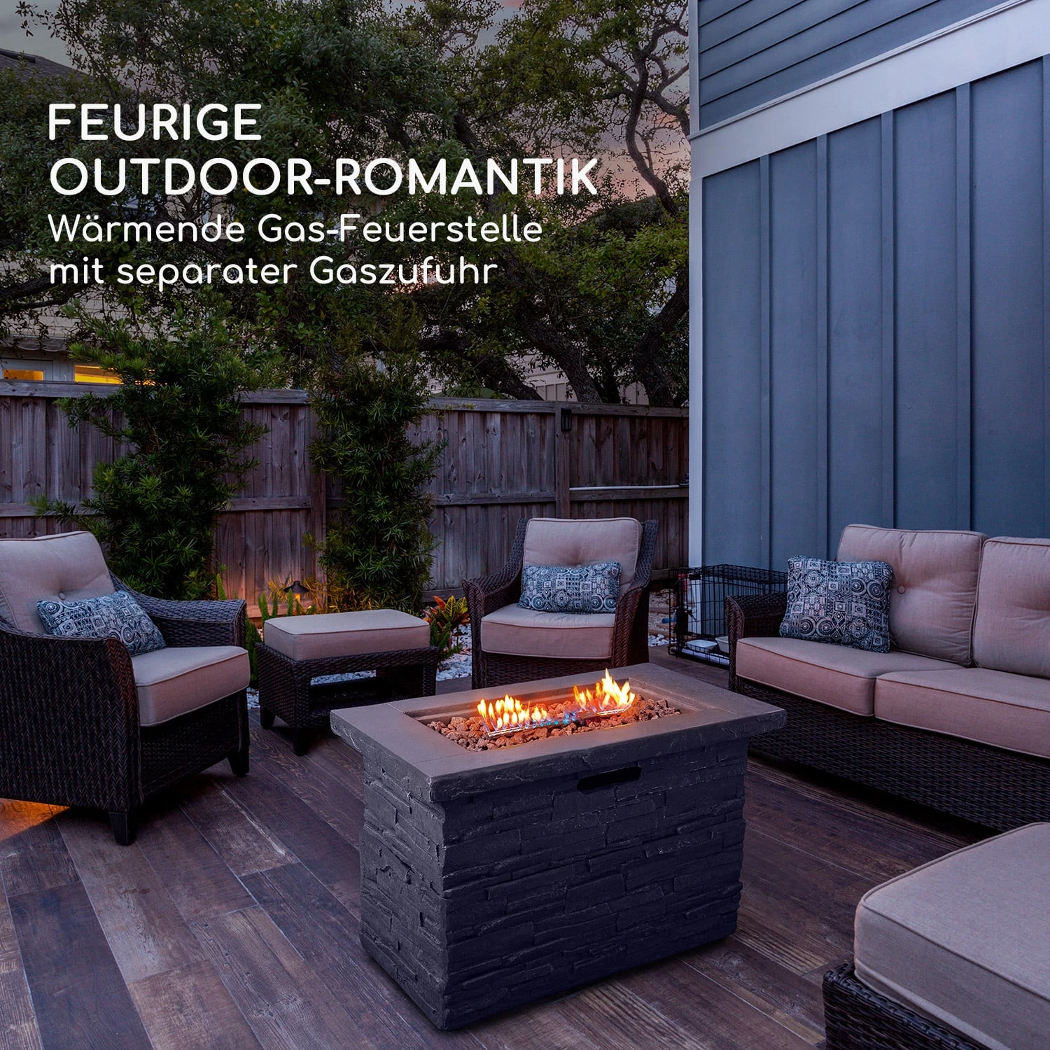 Leistungsstarke Gas-Feuerstelle für Romantik und natürliche Wärme in Outdoor-Oasen: Die blumfeldt Anafi Gas-Feuerstelle verbindet rustikale Schönheit mit komfortabler Funktionalität.
