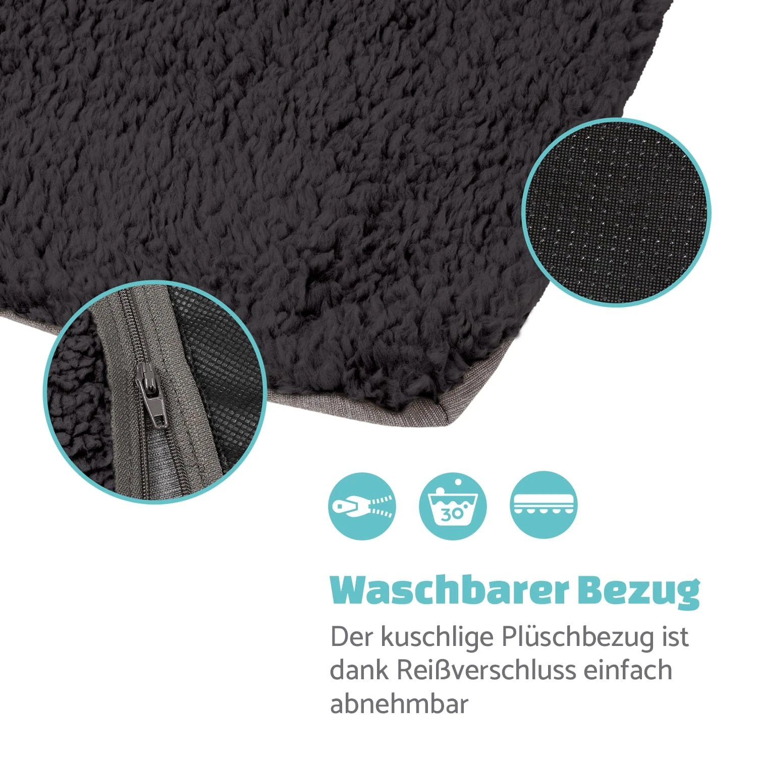 Unser Brunolie Emma Hundebett aus robustem, hochwertigem Material bietet deinem Haustier eine langlebige Ruhezone. Die abziehbaren Bezüge von Matte, Kissen und Lehnen sind waschmaschinenfest und können problemlos bei 30 Grad gewaschen werden. Das Antirutsch-Gewebe an der Unterseite verhindert ungewolltes Verrutschen, sodass einem ausgelassenen Toben im gemütlichen Körbchen nichts im Wege steht.