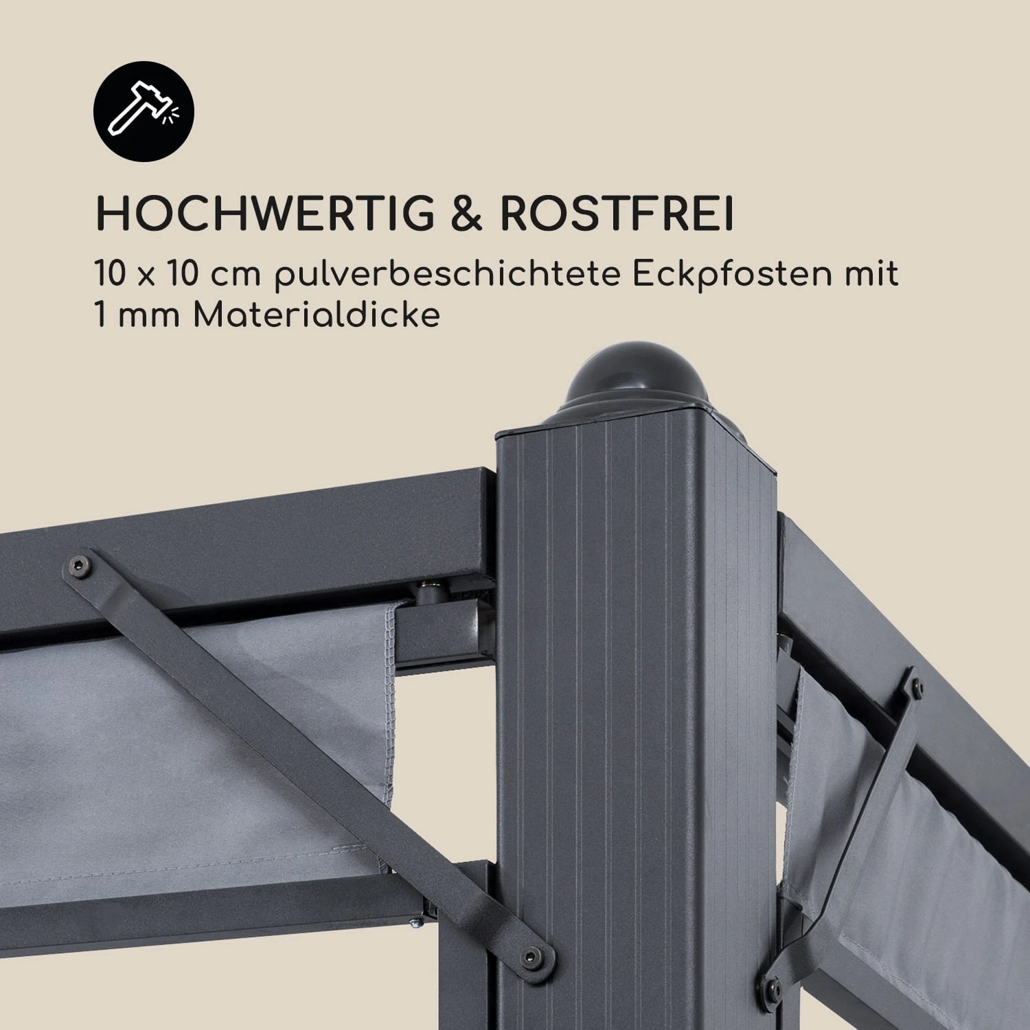 Das Pavillon-Komplettset enthält alles, um ein Areal von 3 x 3 Metern mit wenig Aufwand in einen sommerlichen Schattenplatz zu verwandeln. Das Gerüst aus 10 x 10 cm Pfosten mit 1 mm Materialstärke ist nicht nur äußerst stabil: Dank der Fertigung aus pulverbeschichtetem Aluminium ist es auch sehr leicht. Perfekt für die langfristige Erholung im Freien – ohne Rostbildung.