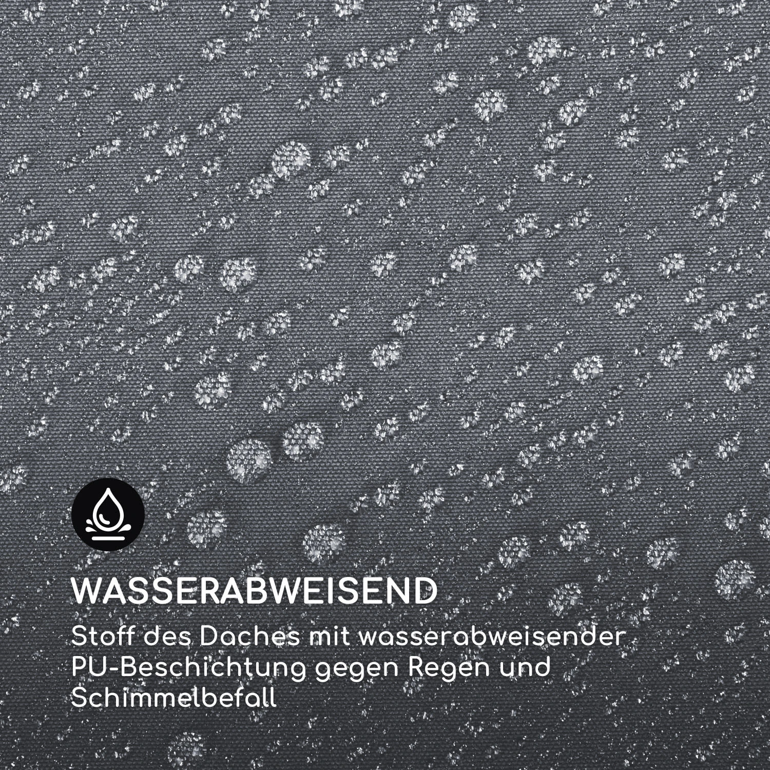 Mit dem stufenlos raffbaren Stoffdach aus 180 g/m² Polyester erhält man die volle Kontrolle über Schatten und Sonne. Der Seilzug lässt das Sonnendach des Pavillons in seinen Führungsschienen geschmeidig vor- und zurückgleiten, die wasserabweisende Beschichtung schützt vor Schimmel und kurzen Regenschauern. Durch die flexibel auf- und abrollbaren Seitenteile aus 160 g/m² Polyester-Stoff bleibt man die ganze Zeit windgeschützt.