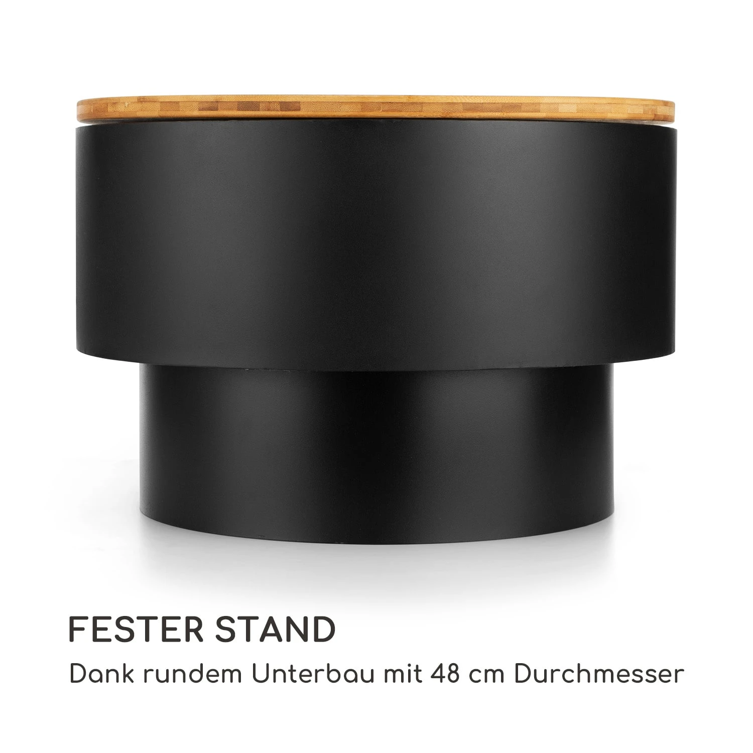 Genieße den Abend im Garten oder auf der Terrasse: Mit der blumfeldt Pompeji Feuerschale & Grill macht es gleich dreifach Spaß. In der 60 cm durchmessenden Feuerschale spenden Scheithölzer, Holzkohle oder Briketts mit flackernden Flammen wohlige Wärme und Lagerfeuer-Atmosphäre. Die solide Schale ist aus 2,5 mm dickem Stahl gefertigt und mit feuerresistenter Farbe versehen – so ist sie witterungsbeständig und robust. Lecker wird es, wenn bei der Pompeji Feuerschale der 56 cm breite verchromte Grillrost aufgesetzt wird. Einfach den Rost auf die Schale setzen und schon kann der Grillspaß losgehen. Der runde Unterbau mit seinen 48 cm Durchmesser sorgt für einen stabilen Stand der Pompeji, egal ob beim Grillen oder bei der Nutzung als Lagerfeuer. Allerdings kannst du die Pompeji Feuerschale mit ihrer mitgelieferten Bambusplatte auch als stylischen Gartentisch nutzen. Ihr runde Form und das elegante Schwarz fügen sich spielend in jedes Garten- oder Terrassenambiente ein.