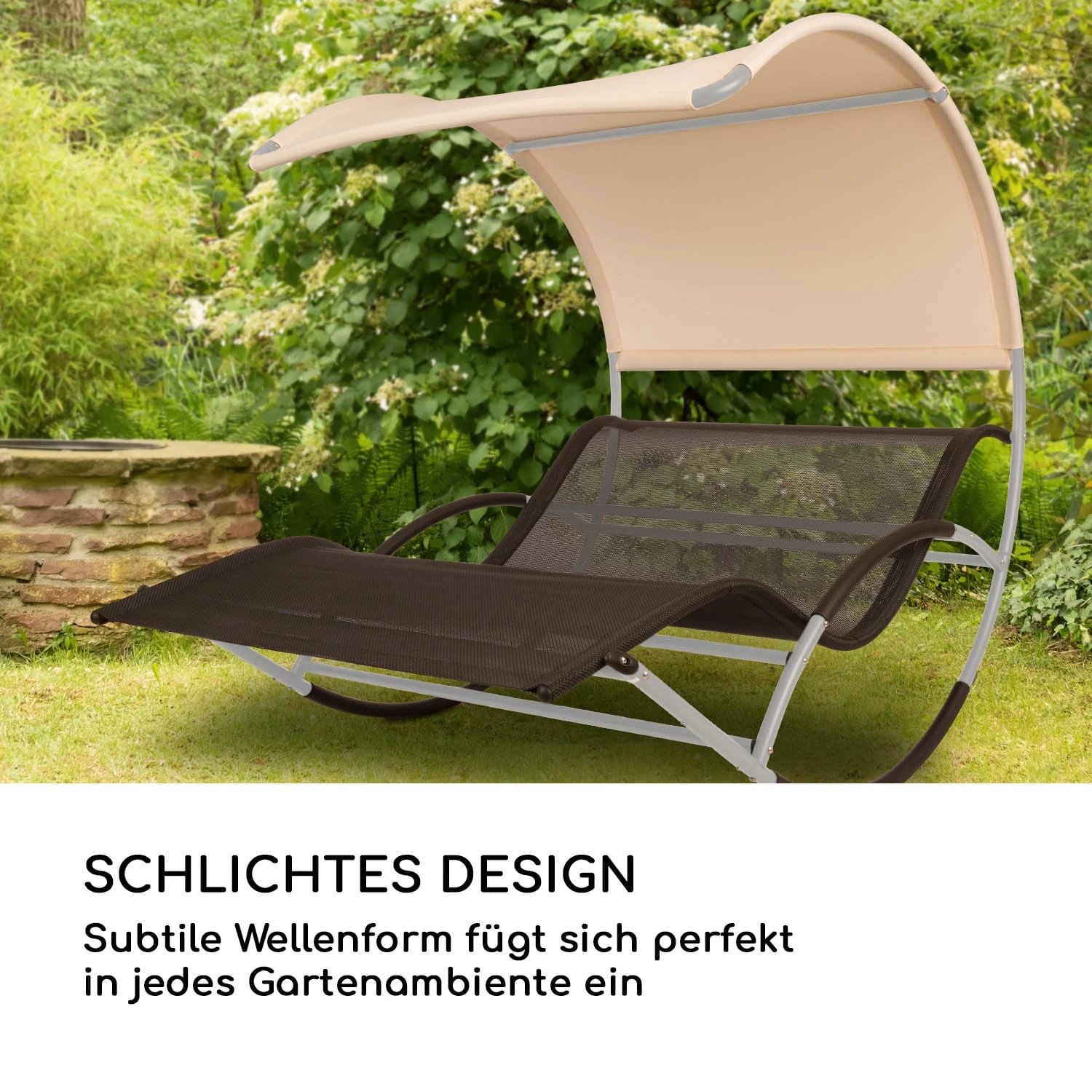 Erholung pur! Verwandeln Sie Ihr Zuhause mit der Blumfeldt The Big Easy Schwingliege in eine Insel der Entspannung. Die Wohlfühloase verfügt über einen stabilen Stahl-Rahmen, der durch seine Pulverbeschichtung vor äußeren Einflüssen geschützt wird. Das Grundgerüst ist mit einem wasserdichten Dach sowie einer Liegefläche (LxB: 200 cm x 130 cm) für 2 Personen bespannt und ermöglicht ein Tragegewicht von bis zu 350 kg. Die schaukelnde Ruhestätte fügt sich durch ihr wellenförmiges Design perfekt in jedes Gartenambiente ein und bietet an heißen Sommertagen verlässlichen UV- und Sonnenschutz über ein gewölbtes Schattendach, das bei Bedarf abgenommen werden kann. Die schaumgeschützte Standvorrichtung eignet sich zudem für sämtliche Bodenbeläge und macht dadurch sowohl eine In- als auch Outdoor-Nutzung möglich. Darüber hinaus unterstützt der ergonomisch geformte Liegebereich die natürliche Form der Wirbelsäule und bietet 2 Personen eine Entspannungsfläche aus bequemem ComfortMesh, das durch seine pflegeleichte Textilstruktur besonders einfach zu reinigen ist.